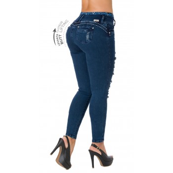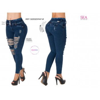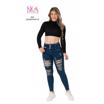 - 66% Algodon - 32% Poliester - 2% Spandex - Corre En Talla Normal - Cotilla Corazon - Moda - Pretina Ancha - Proceso Elaborado a Mano - Rotos - Terminacion de Bota Skinny - Tiro Alto