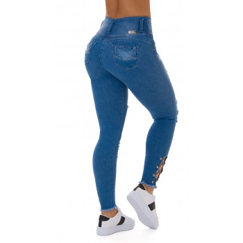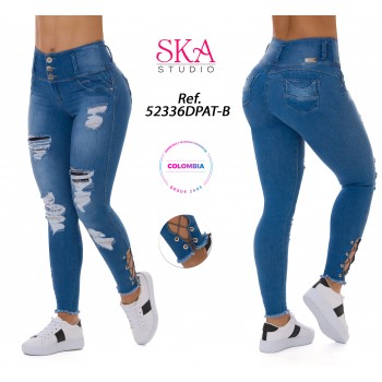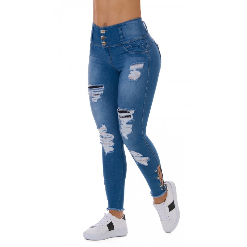 - 68% Algodon - 29% Poliester - 3% Elastano - Cintura Alta Con 3 Botones y Cierre - Con Bolsillo Posterior - Corre En Talla Normal - Cotilla Corazon - Moda - Pretina Ancha - Rotos - Terminacion de Bota con Detalle - Terminacion de Bota Tobillero - Tiro Alto