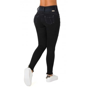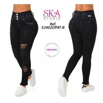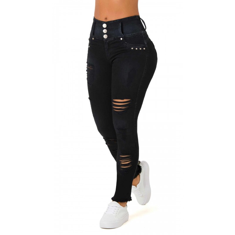 - 62% Algodon - 32% Poliester - 3% Rayon - 3 % Elastano - Cintura Alta Con 3 Botones y Cierre - Corre En Talla Normal - Cotilla Corazon - Moda - Pretina Ancha - Proceso Elaborado a Mano - Rotos - Terminacion de Bota Tobillero - Tiro Alto